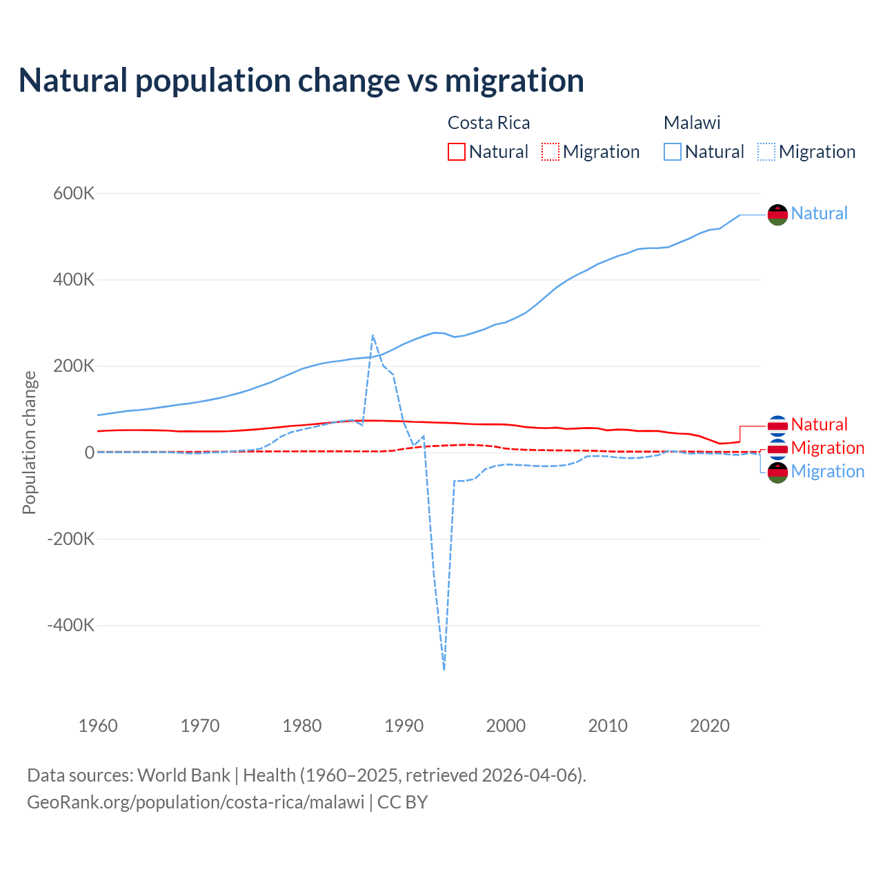 Over the last 10 years, 96.3% of the population change in Costa Rica is from natural causes (a gain of 362,624 people) and 3.69% is from migration (a gain of 13,900 people). In Malawi 99.3% is from natural causes (a gain of 5,019,393 people) and 0.67% is from migration (a loss of 33,768 people).