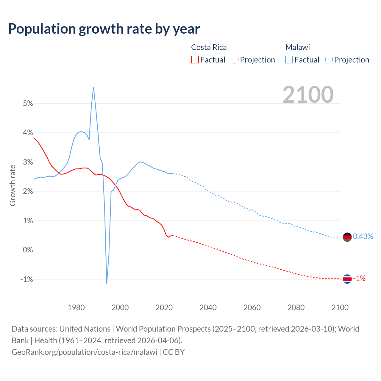 - For the last 10 years, Costa Rica has had an average growth rate of +0.77% per year vs +2.7% in Malawi.