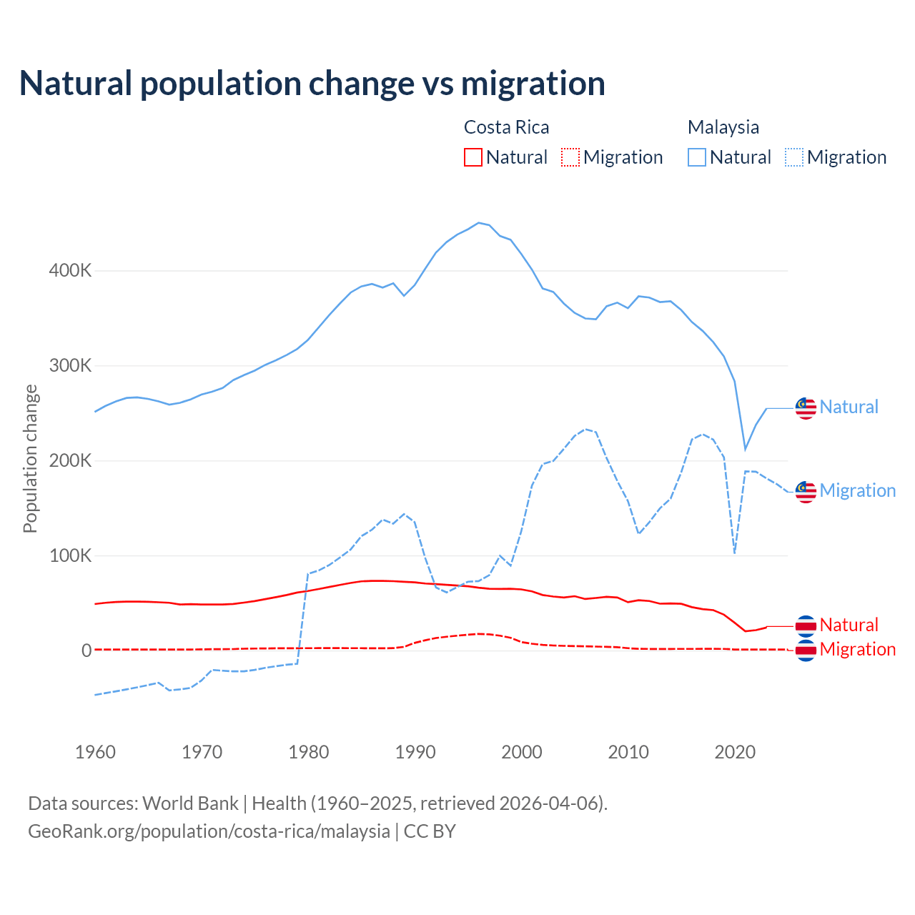 Over the last 10 years, 96.3% of the population change in Costa Rica is from natural causes (a gain of 362,624 people) and 3.69% is from migration (a gain of 13,900 people). In Malaysia 61.7% is from natural causes (a gain of 3,029,648 people) and 38.3% is from migration (a gain of 1,882,159 people).