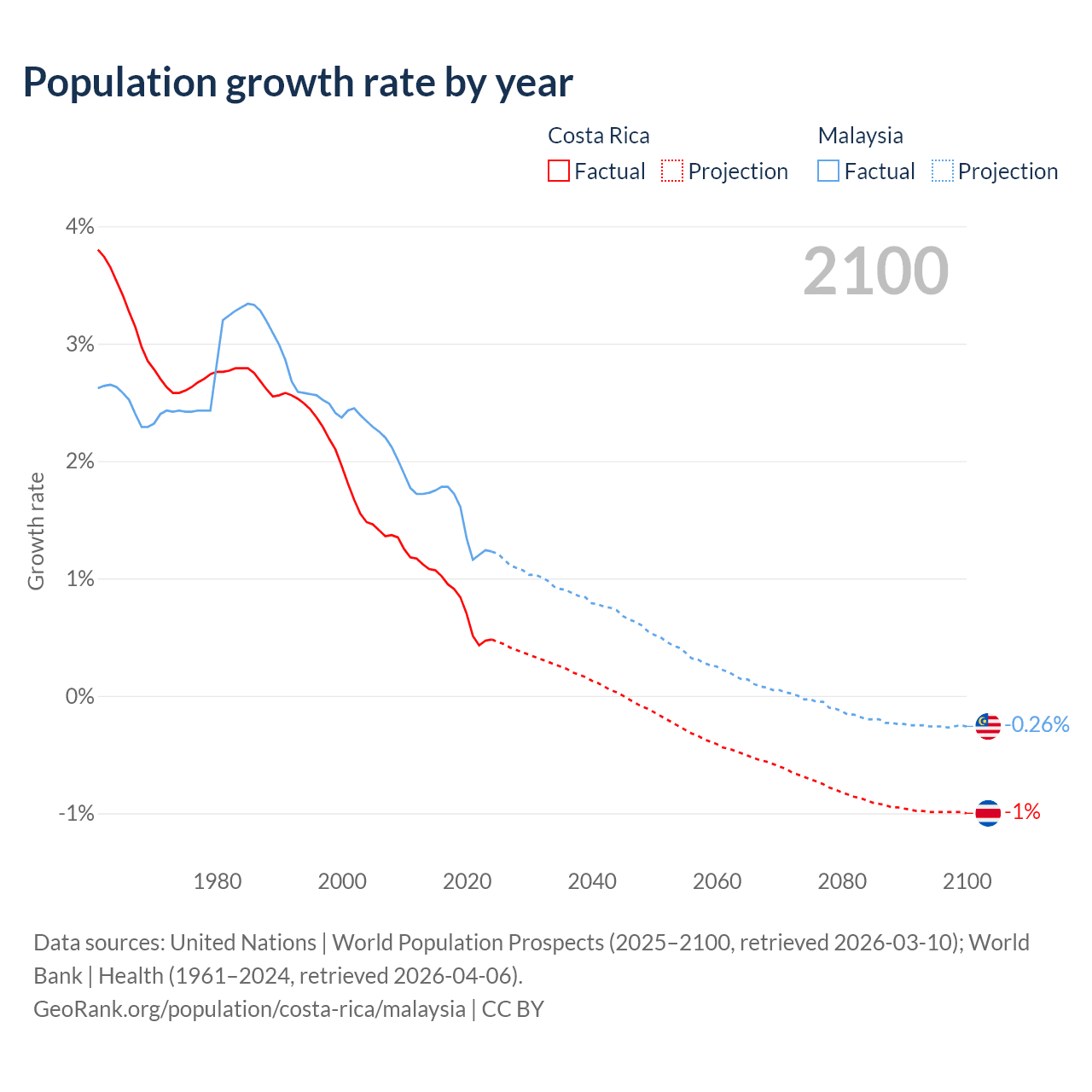 - For the last 10 years, Costa Rica has had an average growth rate of +0.77% per year vs +1.5% in Malaysia.