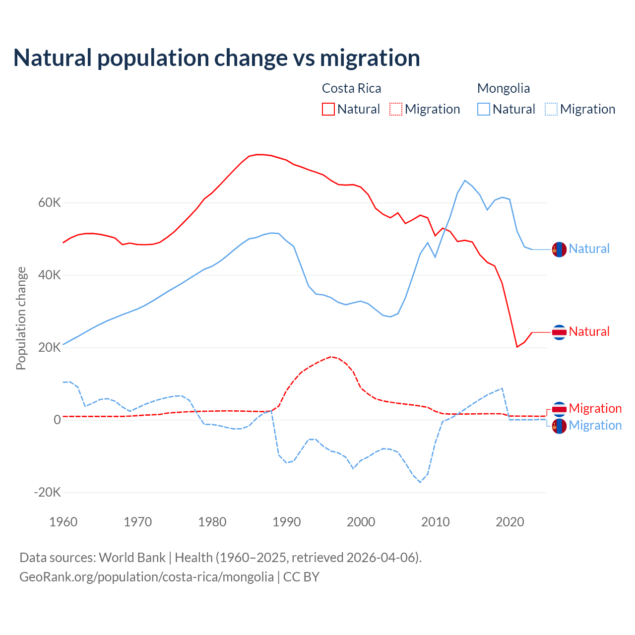 Over the last 10 years, 96.3% of the population change in Costa Rica is from natural causes (a gain of 362,624 people) and 3.69% is from migration (a gain of 13,900 people). In Mongolia 94.1% is from natural causes (a gain of 580,367 people) and 5.87% is from migration (a gain of 36,163 people).