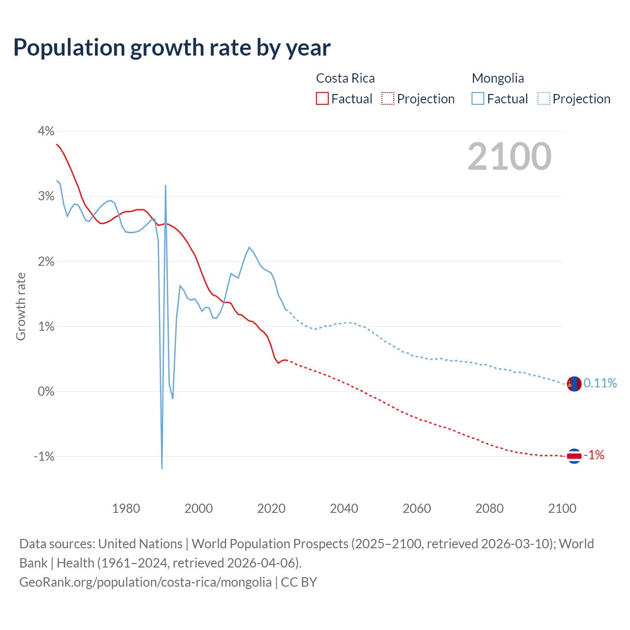 - For the last 10 years, Costa Rica has had an average growth rate of +0.77% per year vs +1.79% in Mongolia.