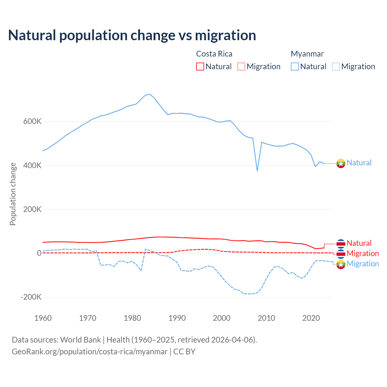 Over the last 10 years, 96.3% of the population change in Costa Rica is from natural causes (a gain of 362,624 people) and 3.69% is from migration (a gain of 13,900 people). In Myanmar 86% is from natural causes (a gain of 4,594,615 people) and 14% is from migration (a loss of 749,272 people).