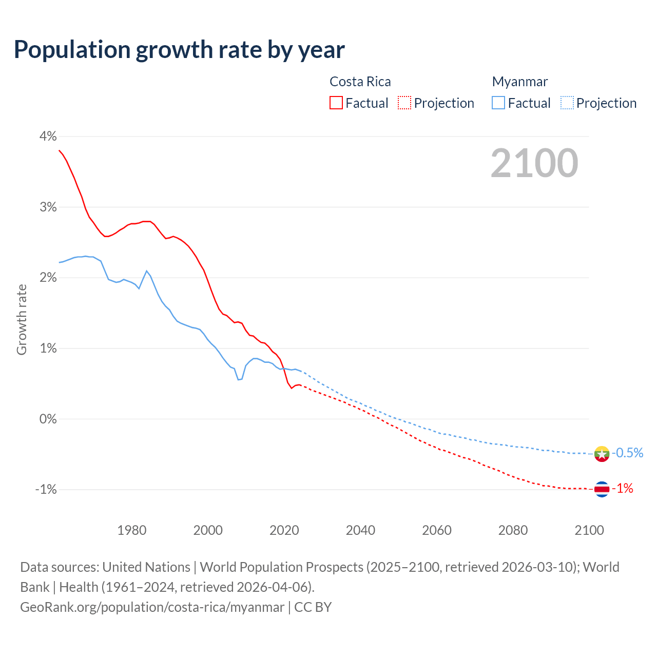 - For the last 10 years, Costa Rica has had an average growth rate of +0.77% per year vs +0.74% in Myanmar.