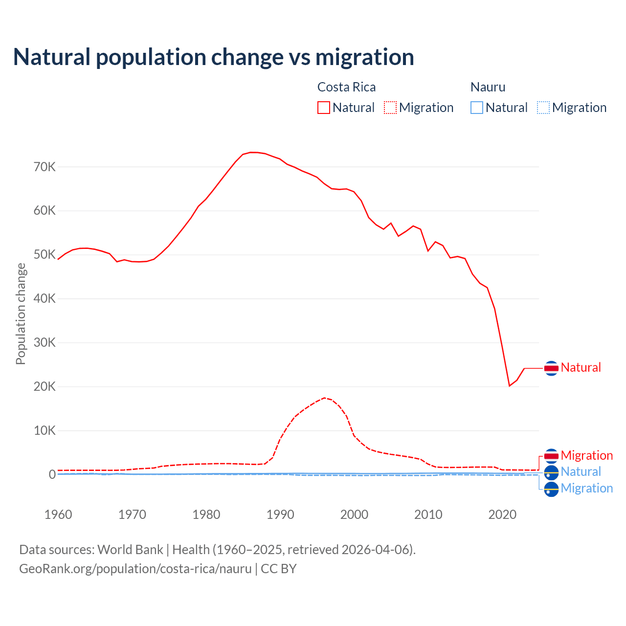 Over the last 10 years, 96.3% of the population change in Costa Rica is from natural causes (a gain of 362,624 people) and 3.69% is from migration (a gain of 13,900 people). In Nauru 66.2% is from natural causes (a gain of 2,590 people) and 33.8% is from migration (a loss of 1,320 people).