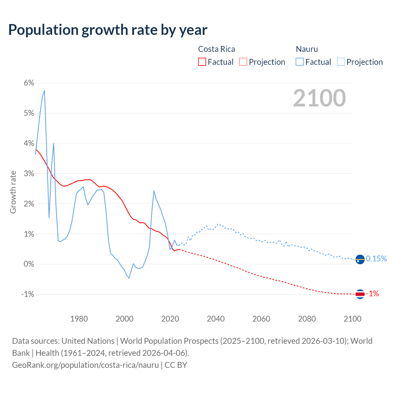 - For the last 10 years, Costa Rica has had an average growth rate of +0.77% per year vs +1.17% in Nauru.
