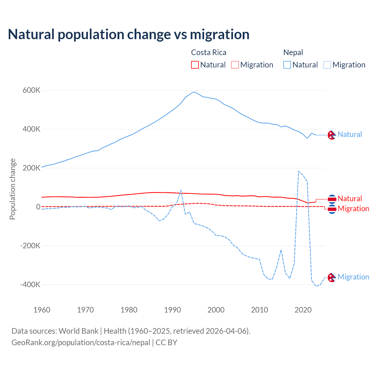 Over the last 10 years, 96.3% of the population change in Costa Rica is from natural causes (a gain of 362,624 people) and 3.69% is from migration (a gain of 13,900 people). In Nepal 67.9% is from natural causes (a gain of 3,909,749 people) and 32.1% is from migration (a loss of 1,851,664 people).
