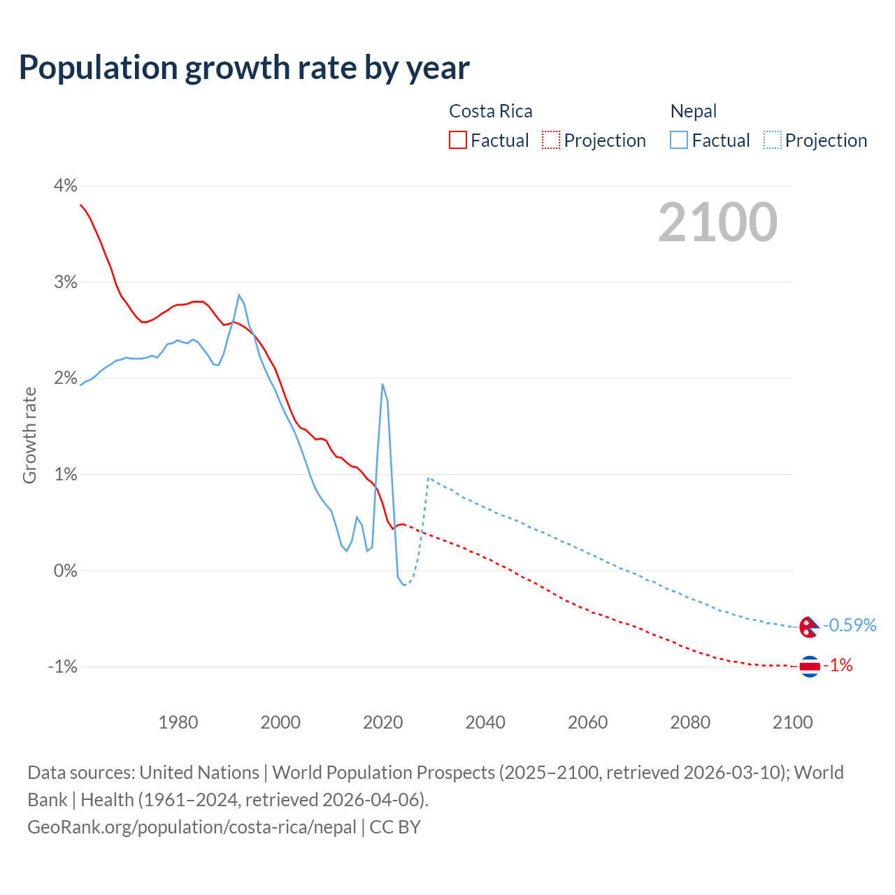 - For the last 10 years, Costa Rica has had an average growth rate of +0.77% per year vs +0.66% in Nepal.