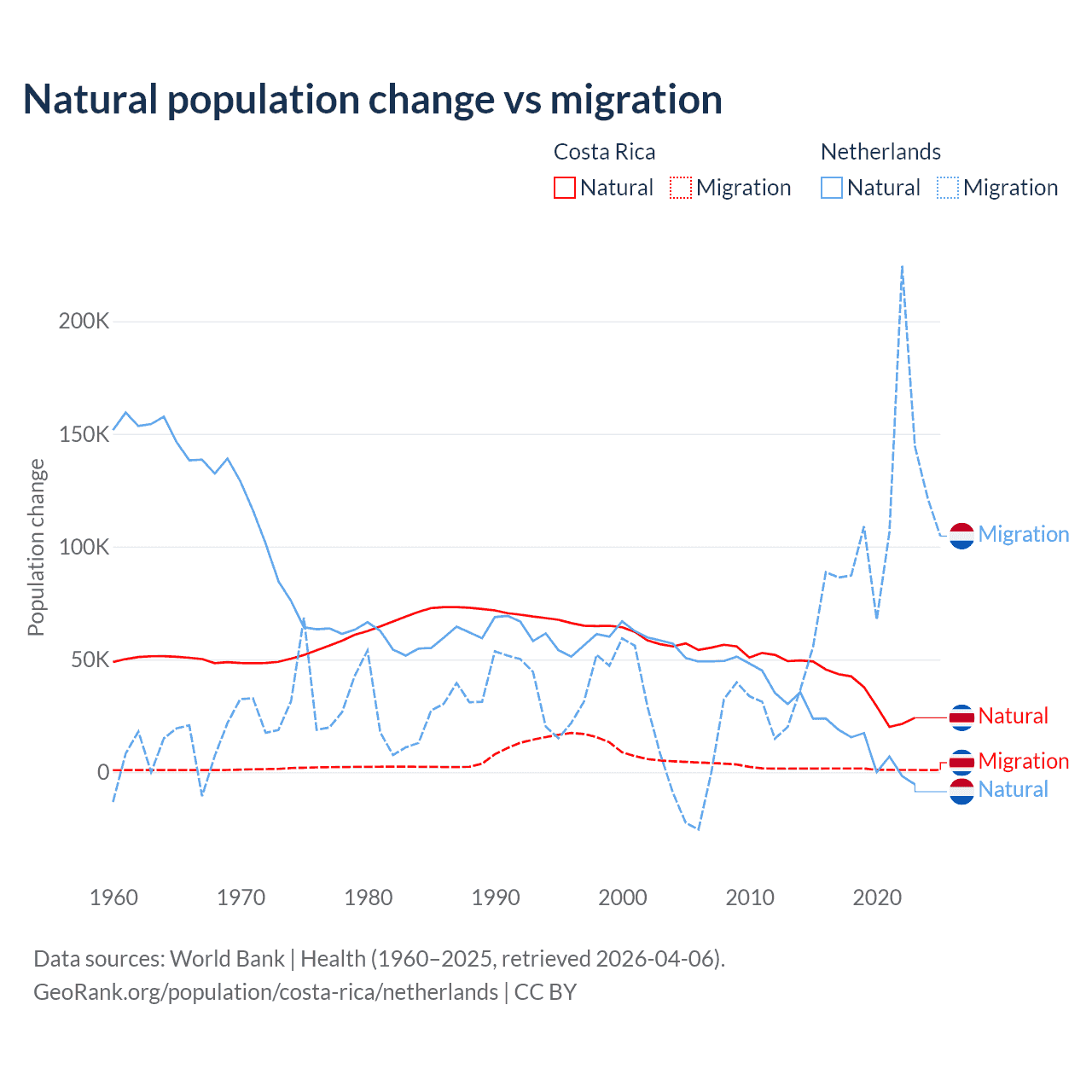 Over the last 10 years, 96.3% of the population change in Costa Rica is from natural causes (a gain of 362,624 people) and 3.69% is from migration (a gain of 13,900 people). In the Netherlands 11.8% is from natural causes (a gain of 134,554 people) and 88.2% is from migration (a gain of 1,006,495 people).