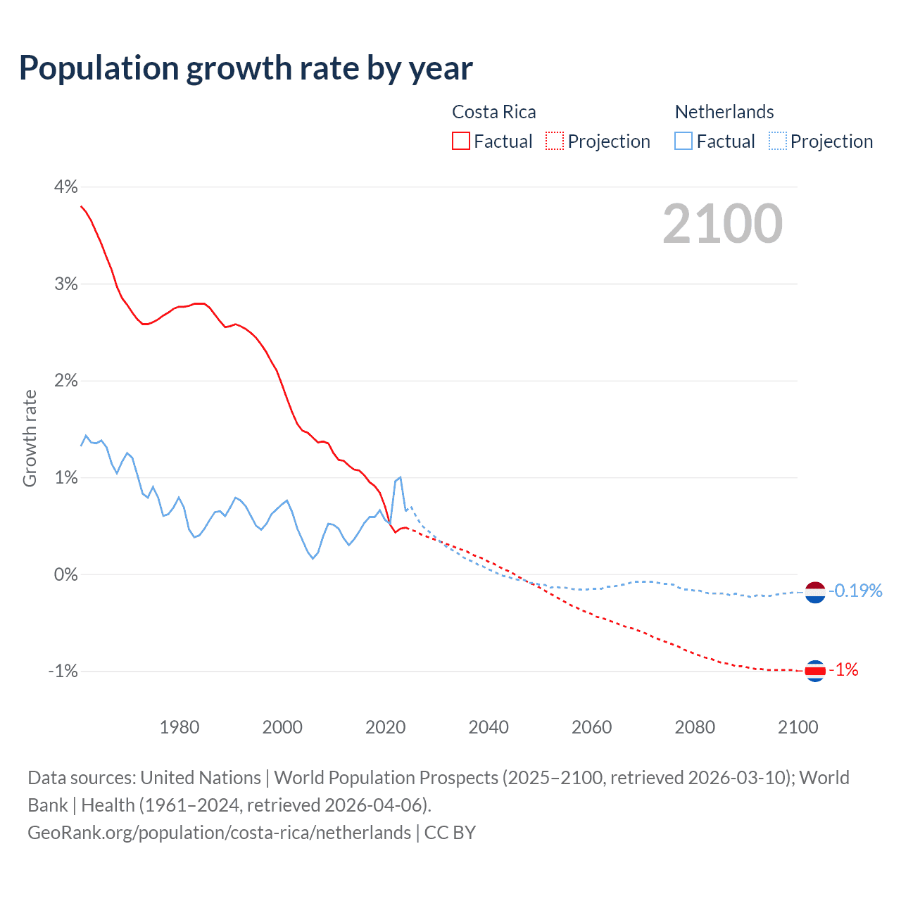 - For the last 10 years, Costa Rica has had an average growth rate of +0.77% per year vs +0.62% in the Netherlands.
