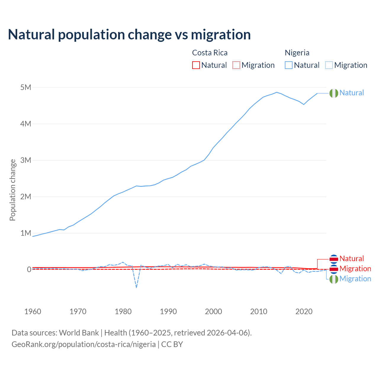 Over the last 10 years, 96.3% of the population change in Costa Rica is from natural causes (a gain of 362,624 people) and 3.69% is from migration (a gain of 13,900 people). In Nigeria 99.2% is from natural causes (a gain of 47,163,517 people) and 0.77% is from migration (a loss of 368,103 people).