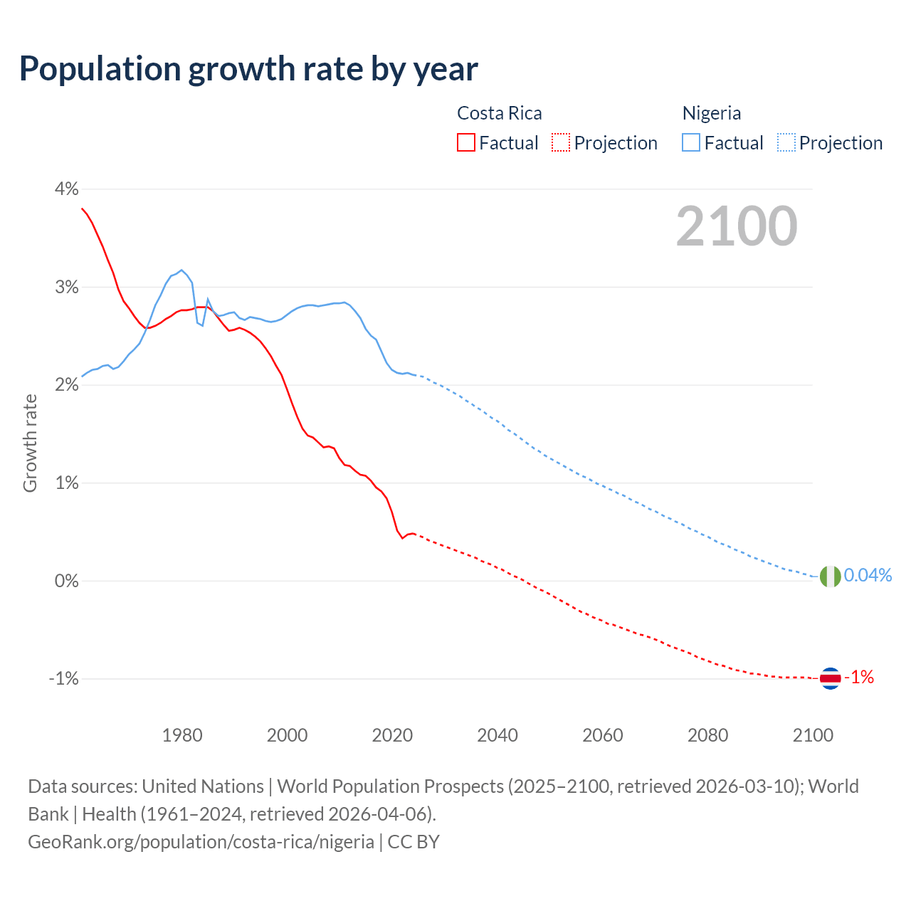 Costa Rica vs Nigeria: population by year and forecast