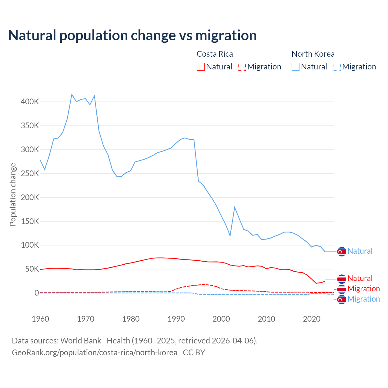 Over the last 10 years, 96.3% of the population change in Costa Rica is from natural causes (a gain of 362,624 people) and 3.69% is from migration (a gain of 13,900 people). In North Korea 97.7% is from natural causes (a gain of 1,097,372 people) and 2.33% is from migration (a loss of 26,227 people).