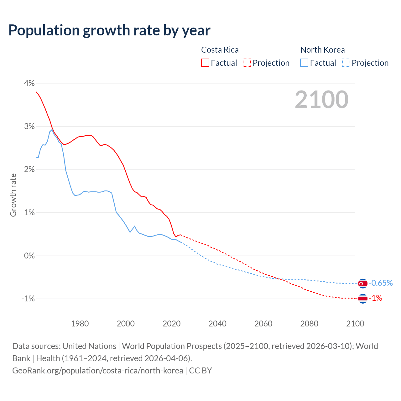 - For the last 10 years, Costa Rica has had an average growth rate of +0.77% per year vs +0.41% in North Korea.