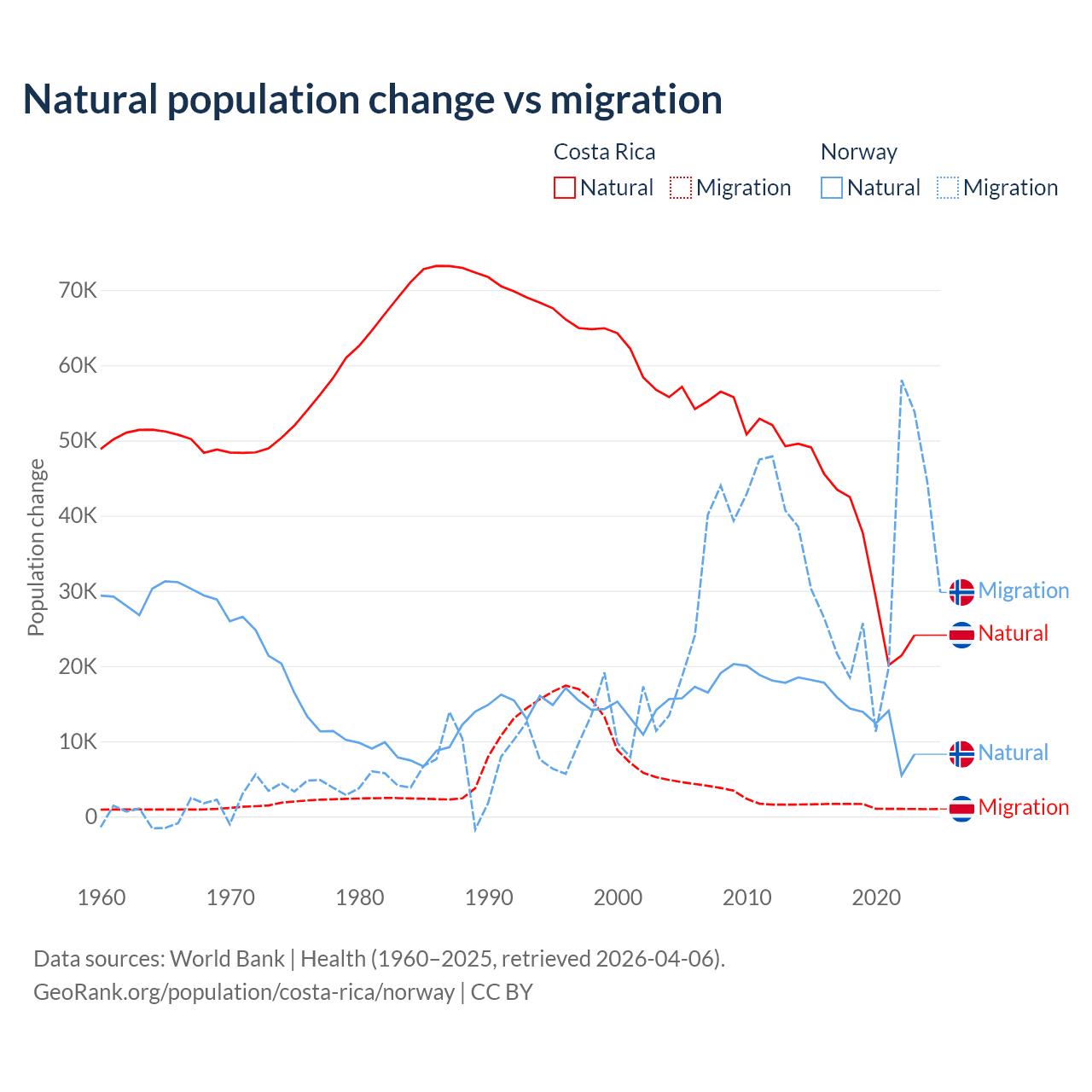 Over the last 10 years, 96.3% of the population change in Costa Rica is from natural causes (a gain of 362,624 people) and 3.69% is from migration (a gain of 13,900 people). In Norway 31.3% is from natural causes (a gain of 138,699 people) and 68.7% is from migration (a gain of 303,945 people).
