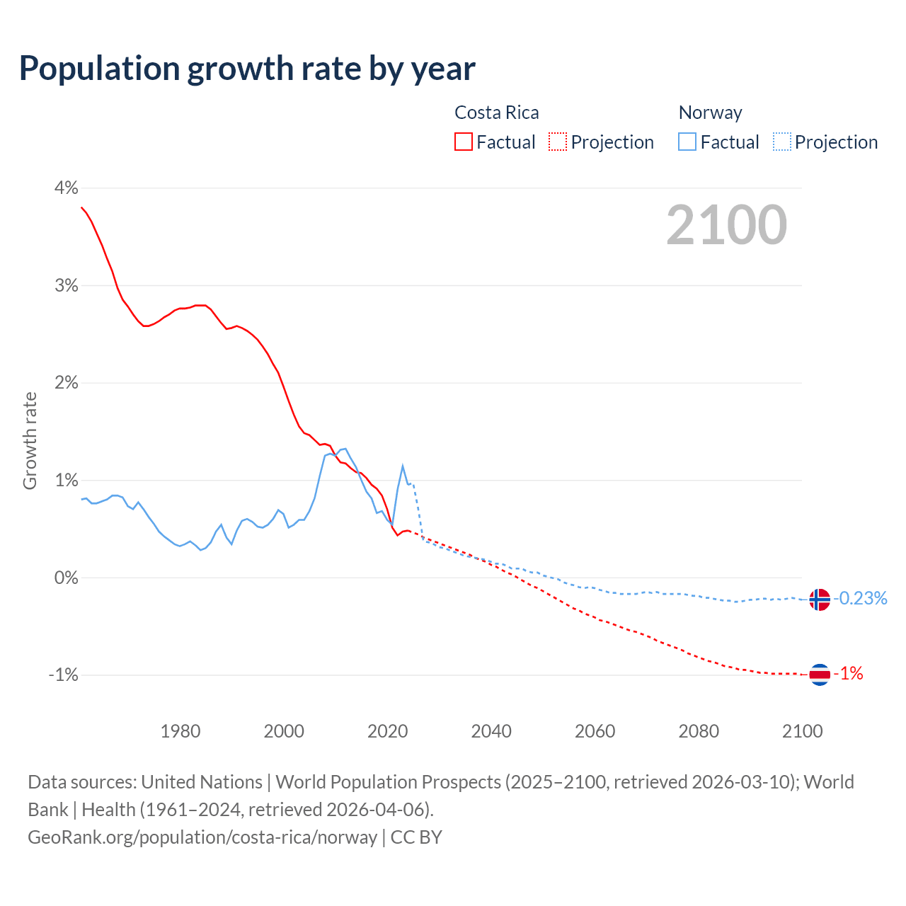 - For the last 10 years, Costa Rica has had an average growth rate of +0.77% per year vs +0.85% in Norway.