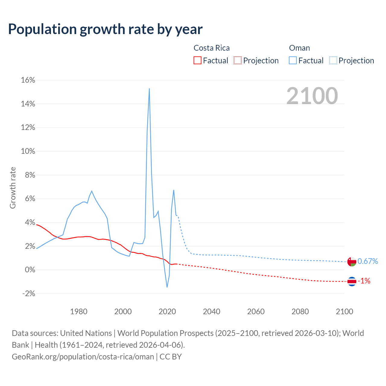 - For the last 10 years, Costa Rica has had an average growth rate of +0.77% per year vs +2.99% in Oman.