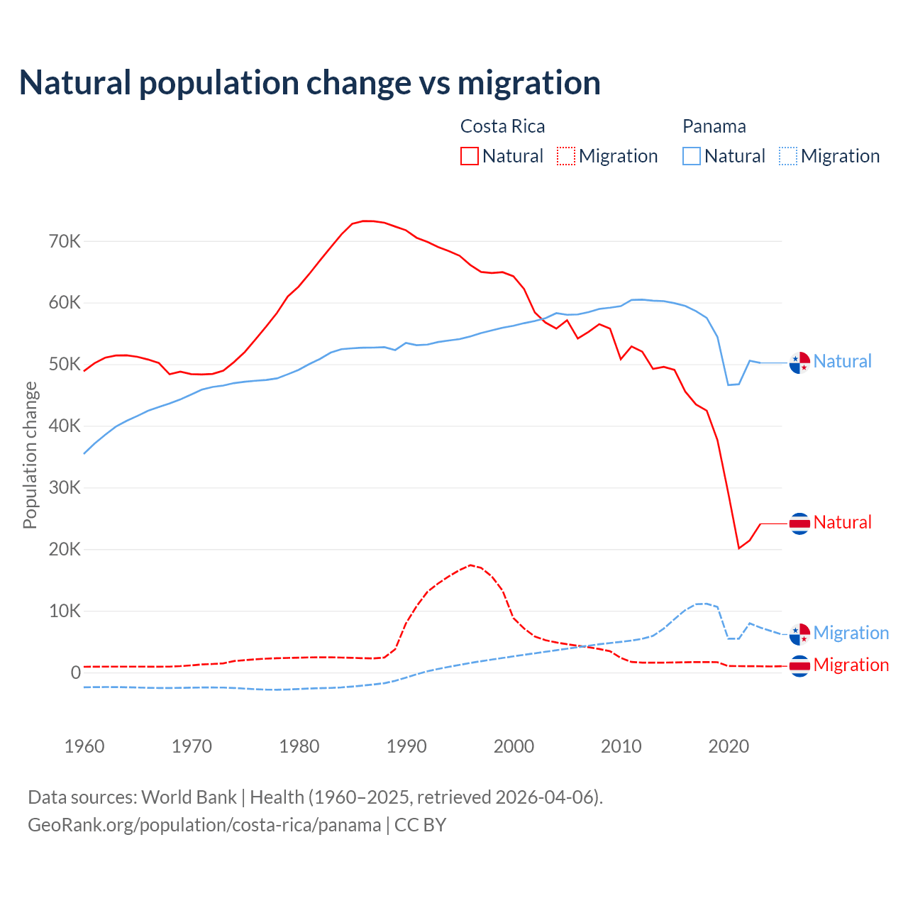 Over the last 10 years, 96.3% of the population change in Costa Rica is from natural causes (a gain of 362,624 people) and 3.69% is from migration (a gain of 13,900 people). In Panama 86.5% is from natural causes (a gain of 544,211 people) and 13.5% is from migration (a gain of 84,849 people).
