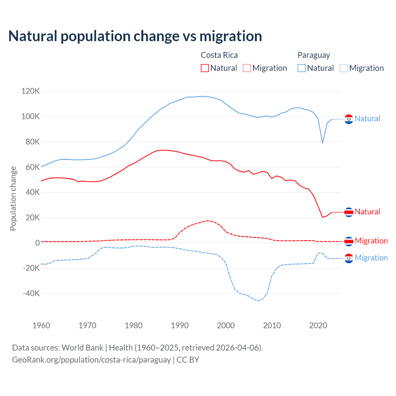 Over the last 10 years, 96.3% of the population change in Costa Rica is from natural causes (a gain of 362,624 people) and 3.69% is from migration (a gain of 13,900 people). In Paraguay 87.6% is from natural causes (a gain of 1,002,636 people) and 12.4% is from migration (a loss of 141,377 people).