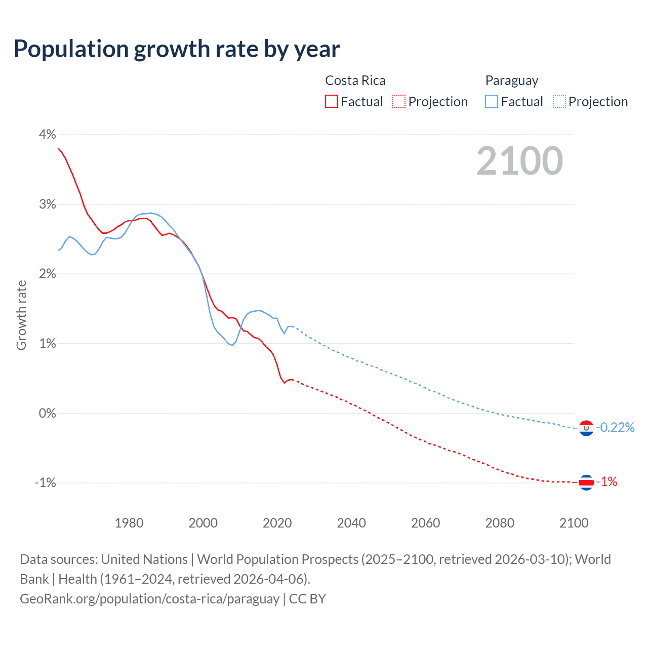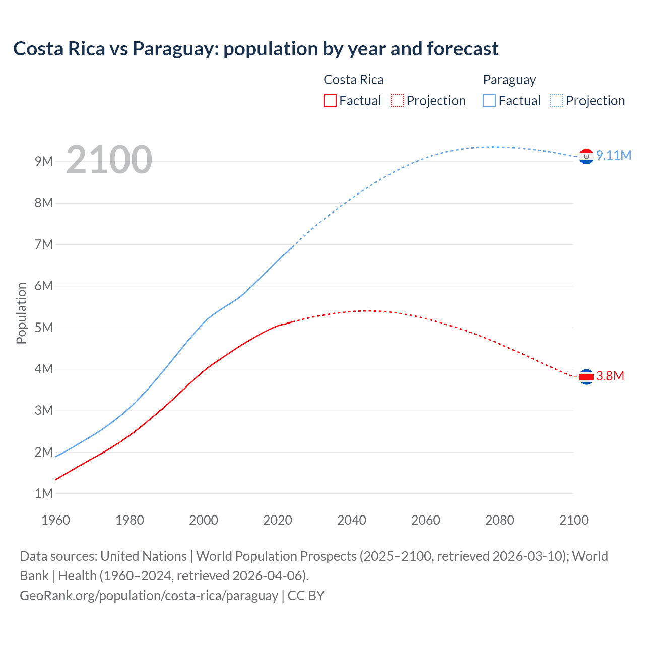 Costa Rica vs Paraguay: population by year and forecast