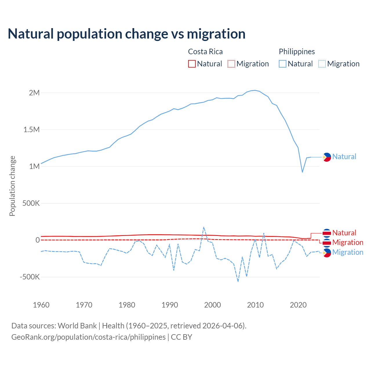 Over the last 10 years, 96.3% of the population change in Costa Rica is from natural causes (a gain of 362,624 people) and 3.69% is from migration (a gain of 13,900 people). In the Philippines 88.5% is from natural causes (a gain of 14,279,705 people) and 11.5% is from migration (a loss of 1,848,117 people).