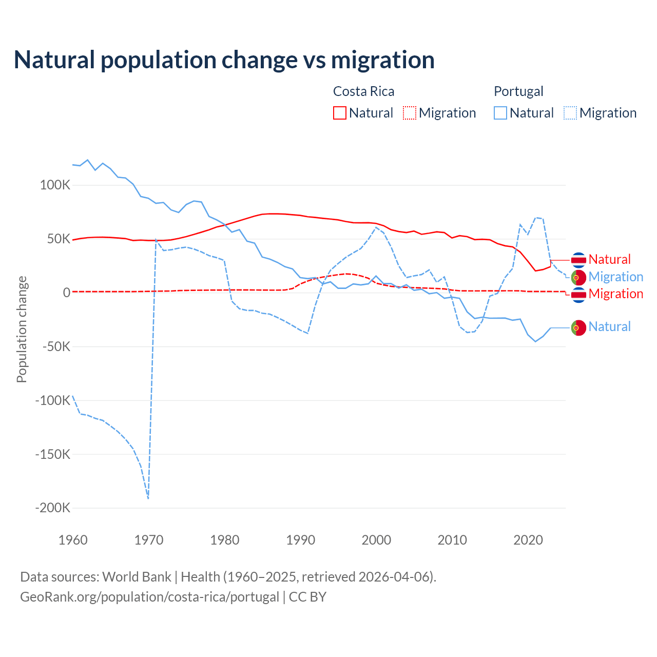 Over the last 10 years, 96.3% of the population change in Costa Rica is from natural causes (a gain of 362,624 people) and 3.69% is from migration (a gain of 13,900 people). In Portugal 51% is from natural causes (a loss of 302,748 people) and 49% is from migration (a gain of 290,554 people).