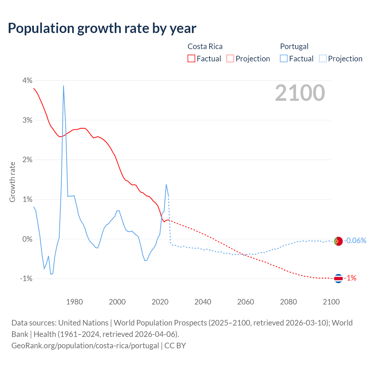 - For the last 10 years, Costa Rica has had an average growth rate of +0.77% per year vs +0.21% in Portugal.