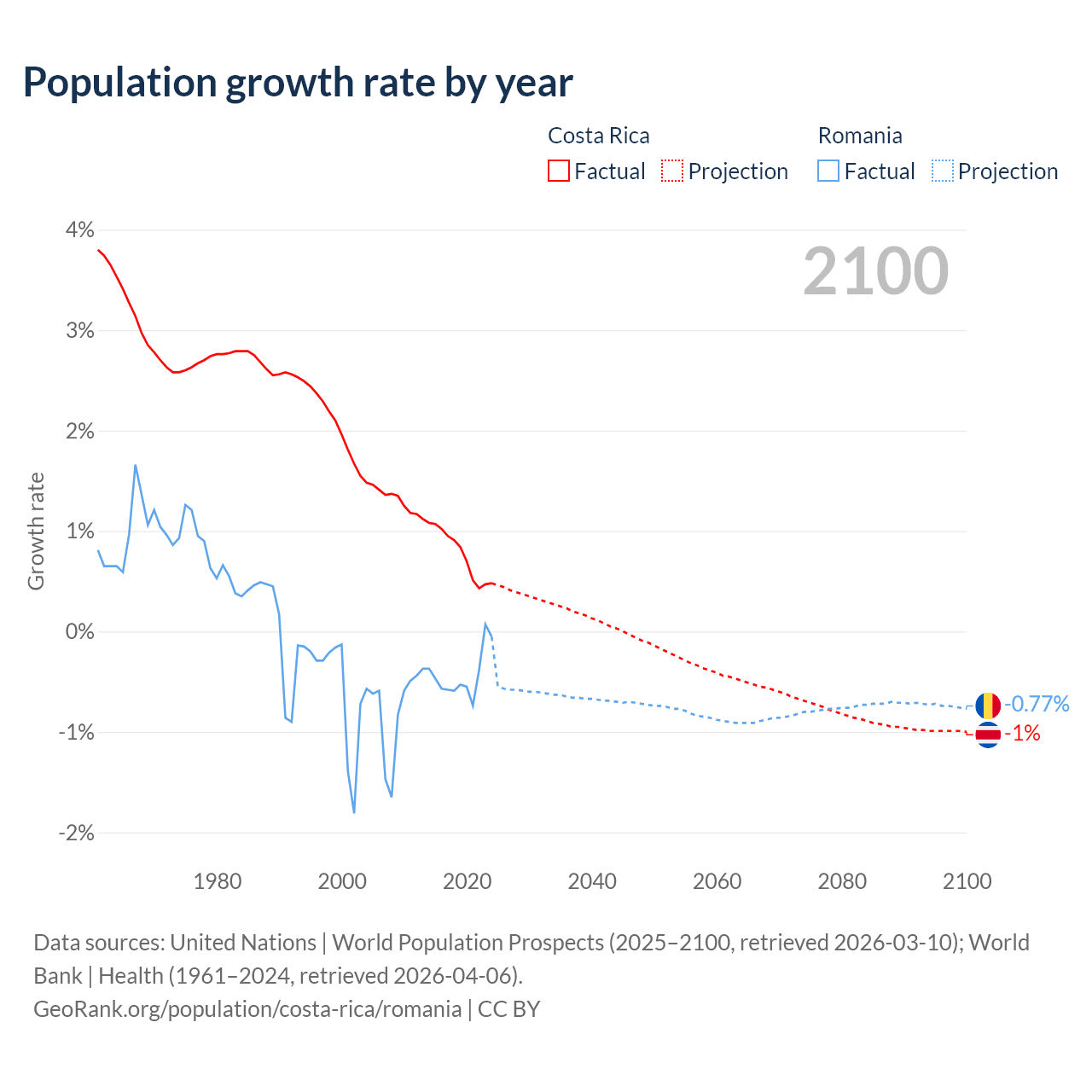 - For the last 10 years, Costa Rica has had an average growth rate of +0.77% per year vs -0.43% in Romania.