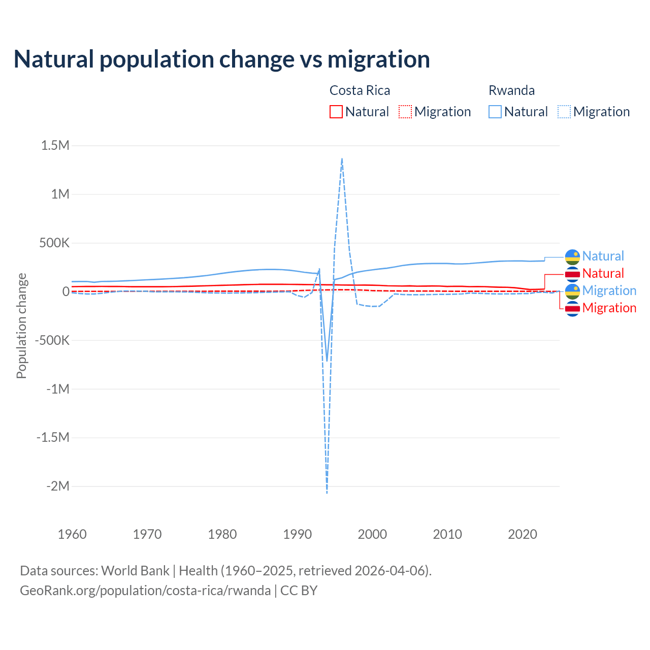 Over the last 10 years, 96.3% of the population change in Costa Rica is from natural causes (a gain of 362,624 people) and 3.69% is from migration (a gain of 13,900 people). In Rwanda 93.8% is from natural causes (a gain of 3,081,296 people) and 6.18% is from migration (a loss of 203,035 people).