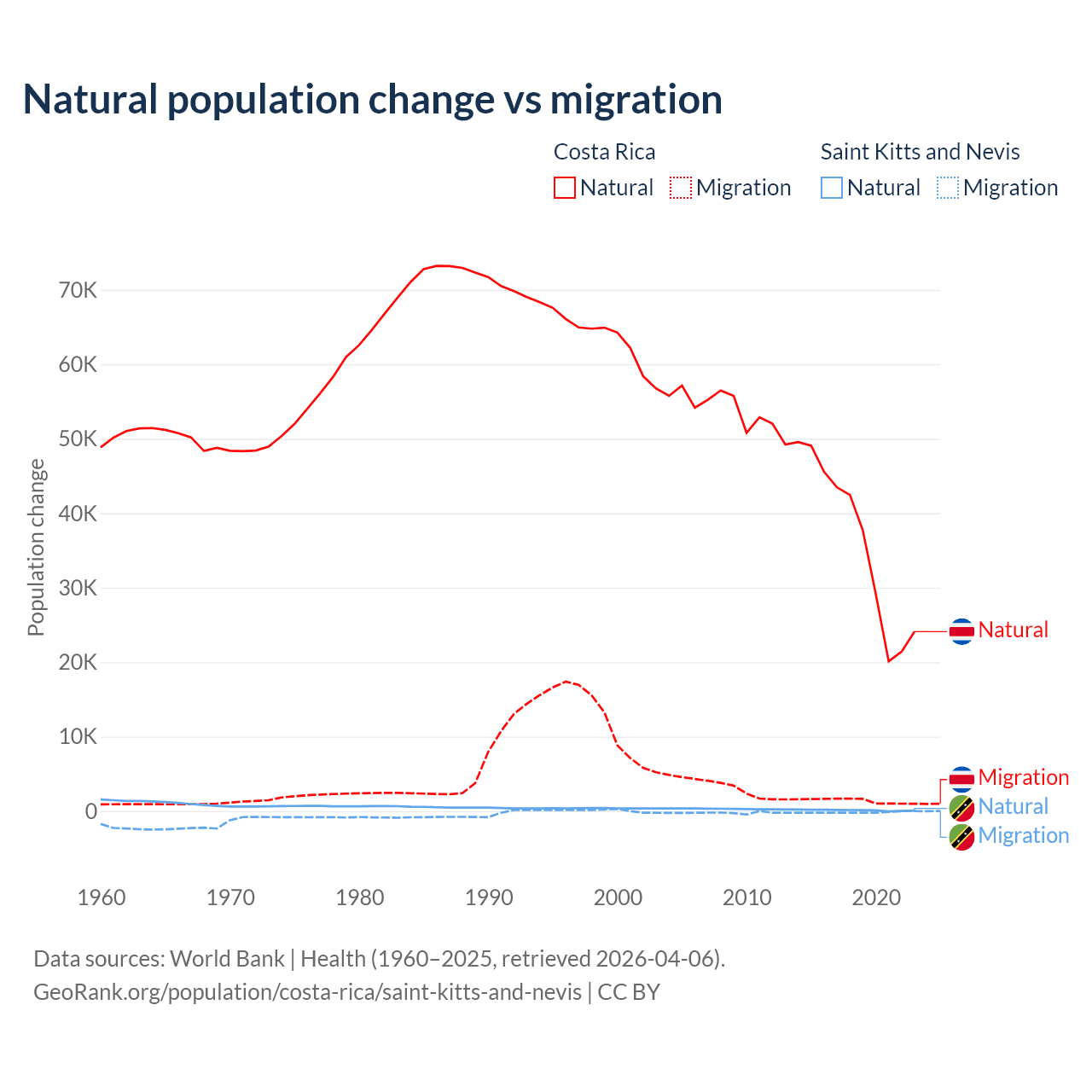 Over the last 10 years, 96.3% of the population change in Costa Rica is from natural causes (a gain of 362,624 people) and 3.69% is from migration (a gain of 13,900 people). In Saint Kitts and Nevis 44.9% is from natural causes (a gain of 1,225 people) and 55.1% is from migration (a loss of 1,506 people).