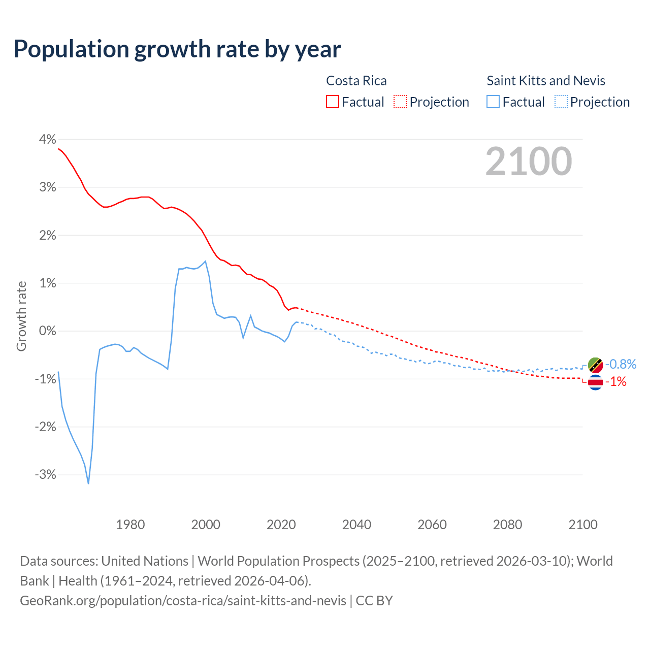 - For the last 10 years, Costa Rica has had an average growth rate of +0.77% per year vs -0.04% in Saint Kitts and Nevis.