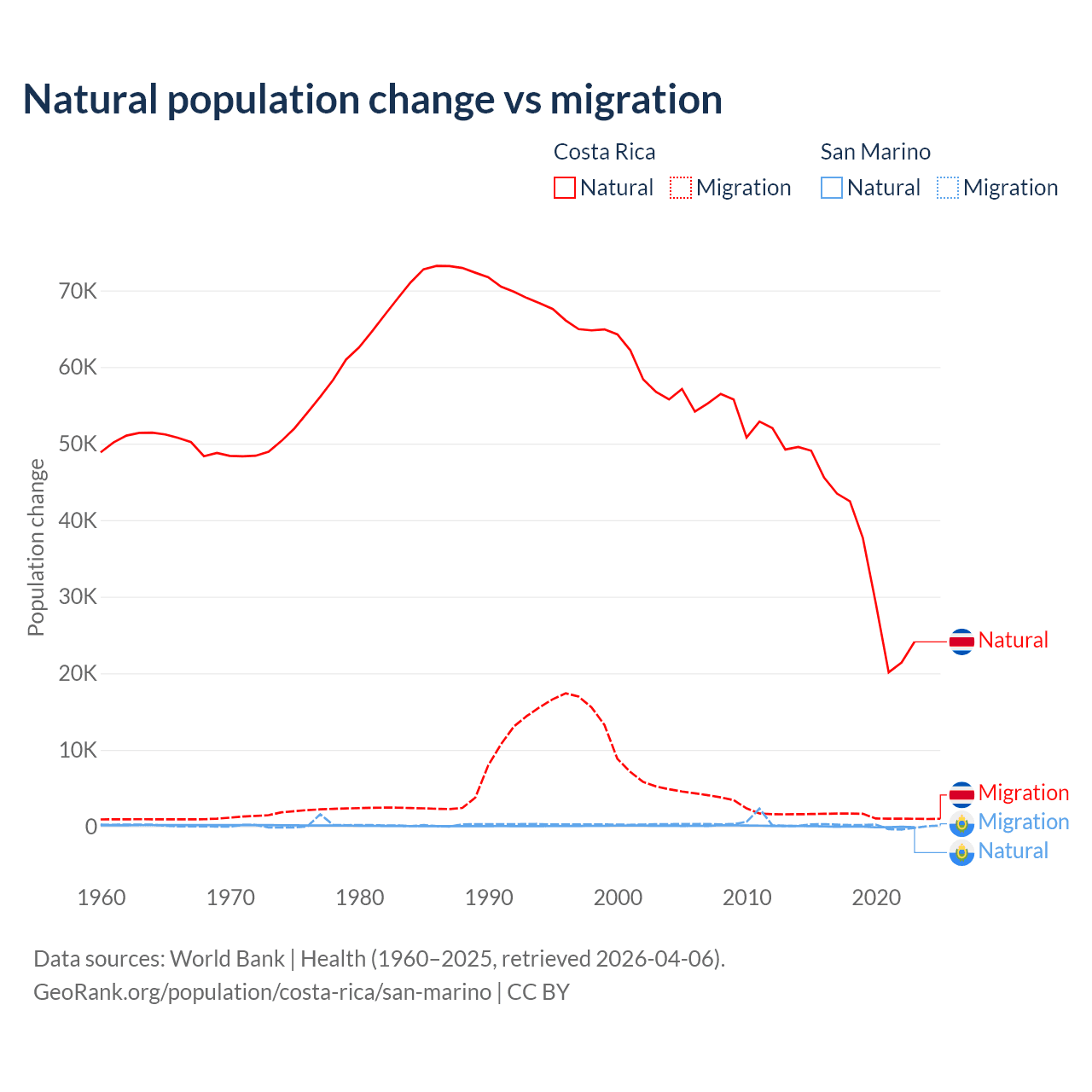 Over the last 10 years, 96.3% of the population change in Costa Rica is from natural causes (a gain of 362,624 people) and 3.69% is from migration (a gain of 13,900 people). In San Marino 40.9% is from natural causes (a loss of 358 people) and 59.1% is from migration (a gain of 517 people).