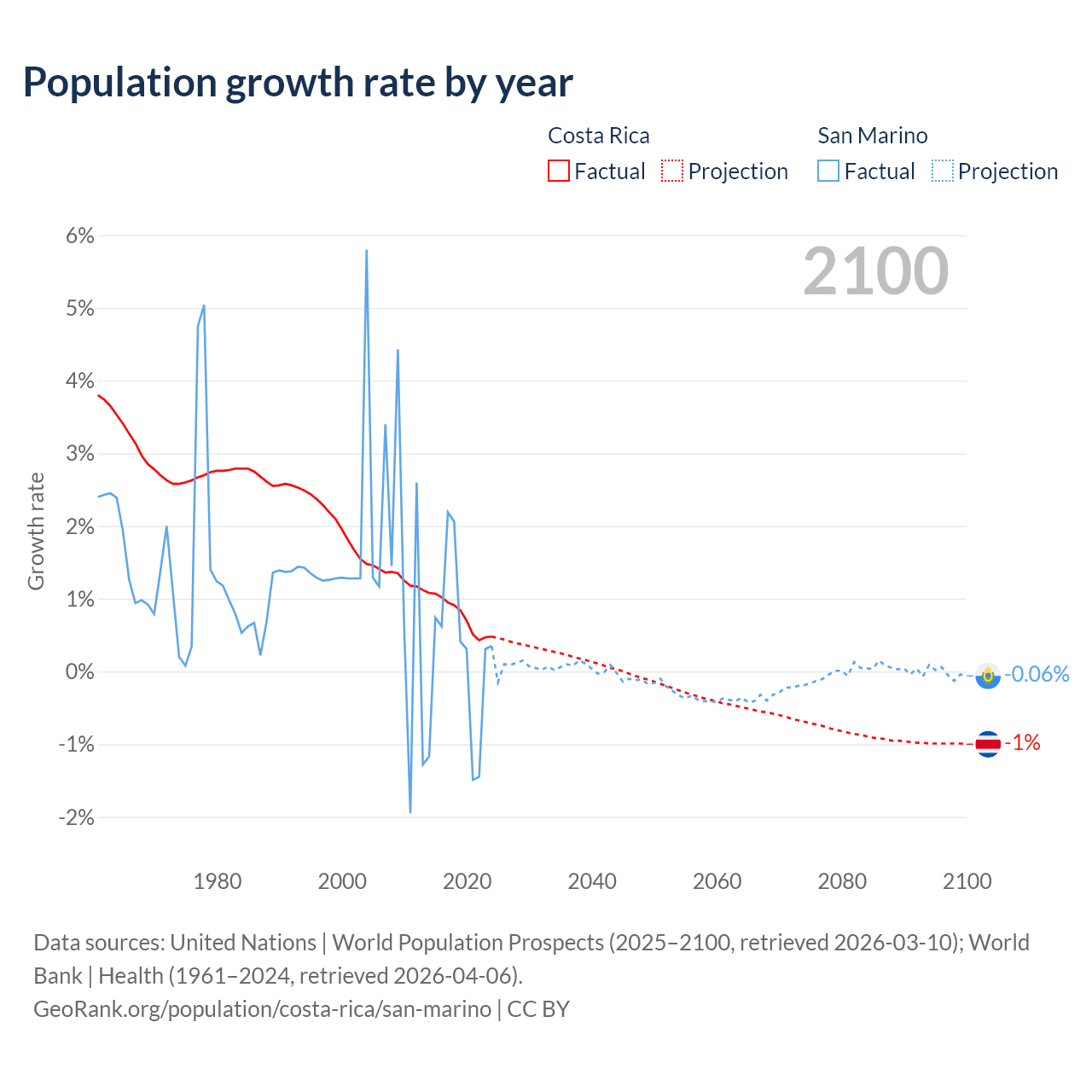 Costa Rica vs San Marino: population by year and forecast