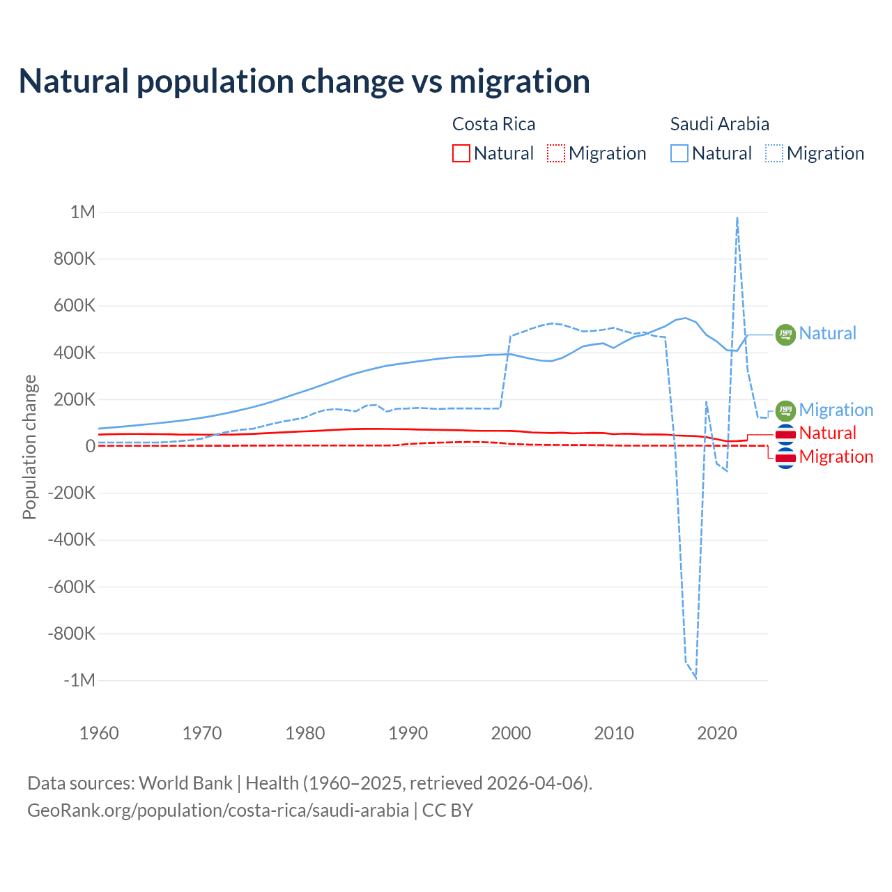 Over the last 10 years, 96.3% of the population change in Costa Rica is from natural causes (a gain of 362,624 people) and 3.69% is from migration (a gain of 13,900 people). In Saudi Arabia 93.9% is from natural causes (a gain of 4,829,562 people) and 6.05% is from migration (a gain of 311,209 people).