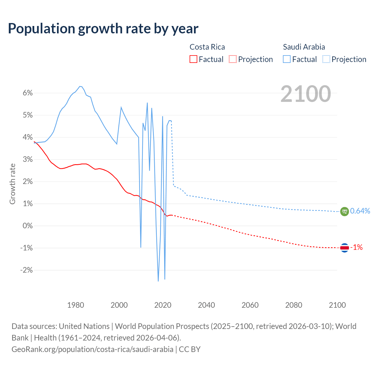 - For the last 10 years, Costa Rica has had an average growth rate of +0.77% per year vs +2.3% in Saudi Arabia.