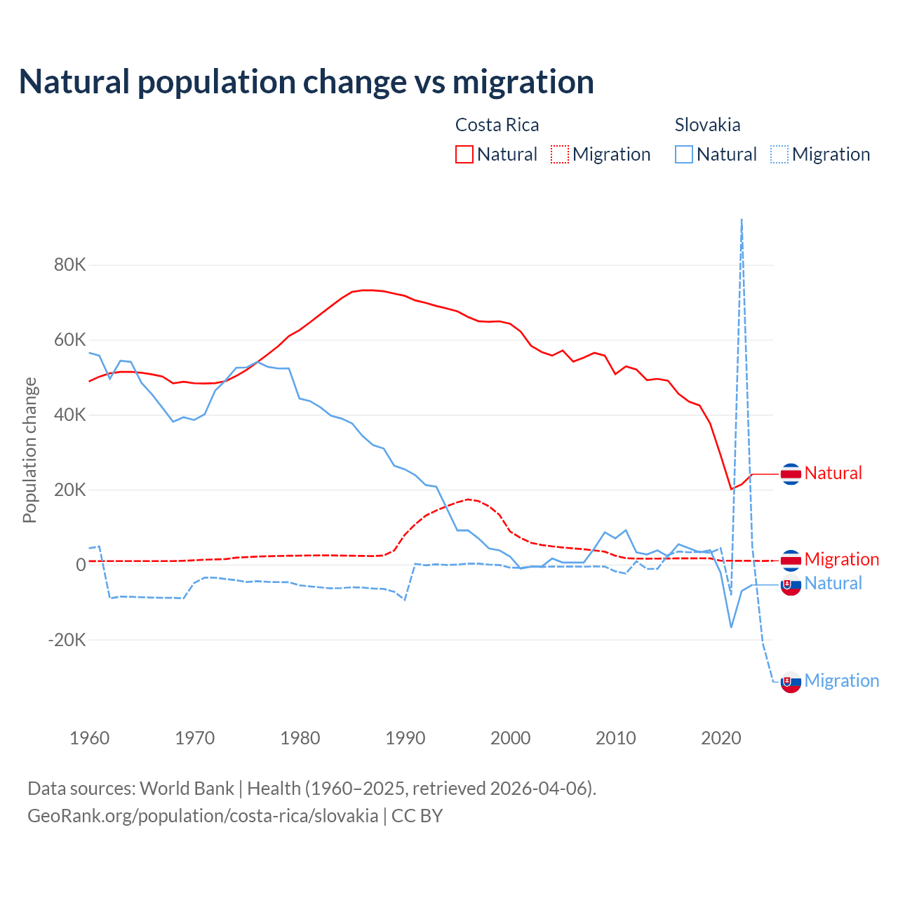 Over the last 10 years, 96.3% of the population change in Costa Rica is from natural causes (a gain of 362,624 people) and 3.69% is from migration (a gain of 13,900 people). In Slovakia 7.47% is from natural causes (a loss of 8,728 people) and 92.5% is from migration (a gain of 108,156 people).