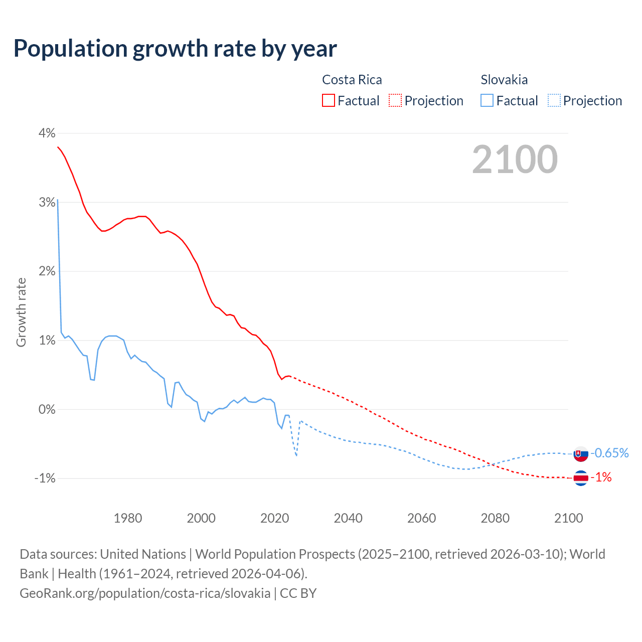- For the last 10 years, Costa Rica has had an average growth rate of +0.77% per year vs +0.01% in Slovakia.