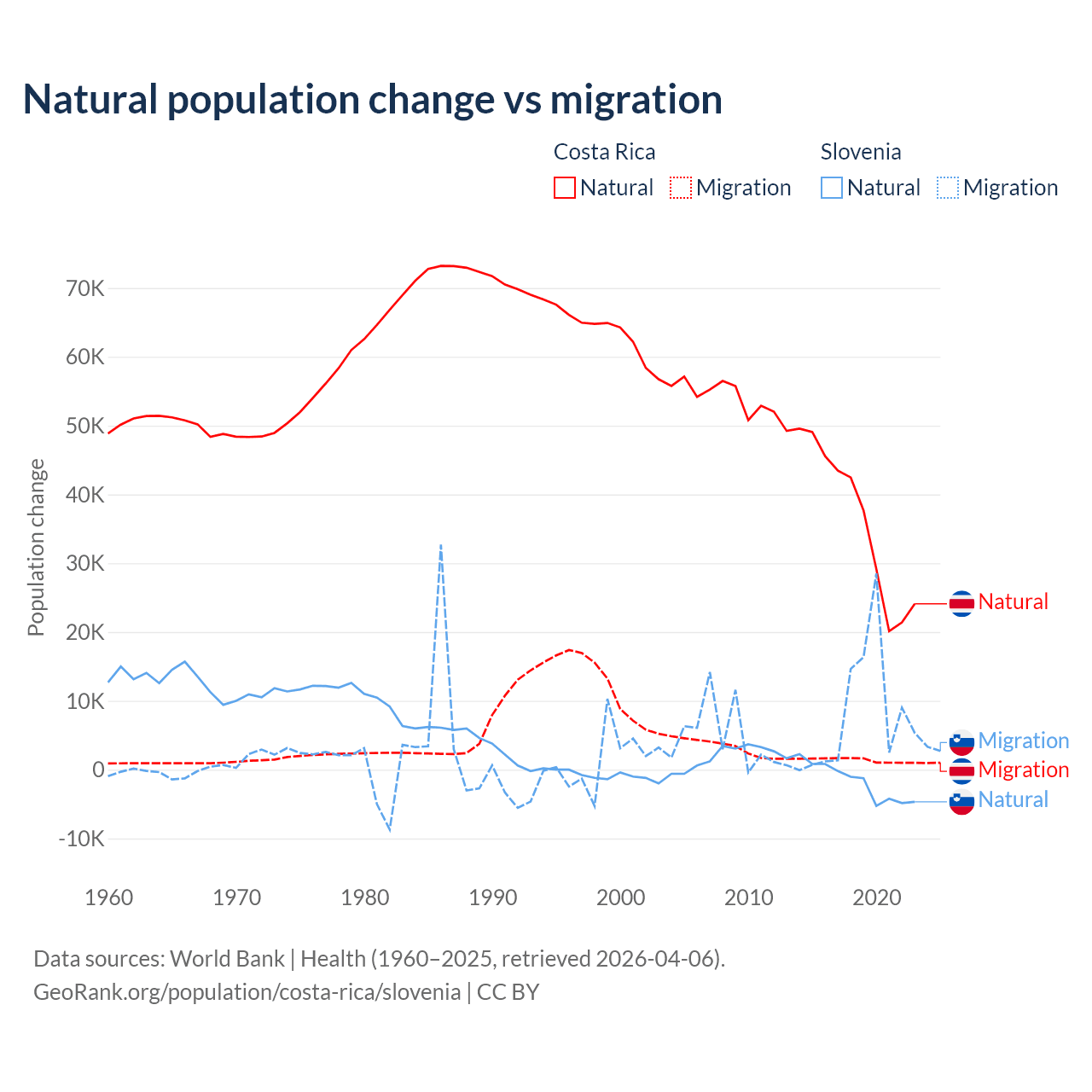 Over the last 10 years, 96.3% of the population change in Costa Rica is from natural causes (a gain of 362,624 people) and 3.69% is from migration (a gain of 13,900 people). In Slovenia 18.1% is from natural causes (a loss of 17,573 people) and 81.9% is from migration (a gain of 79,532 people).