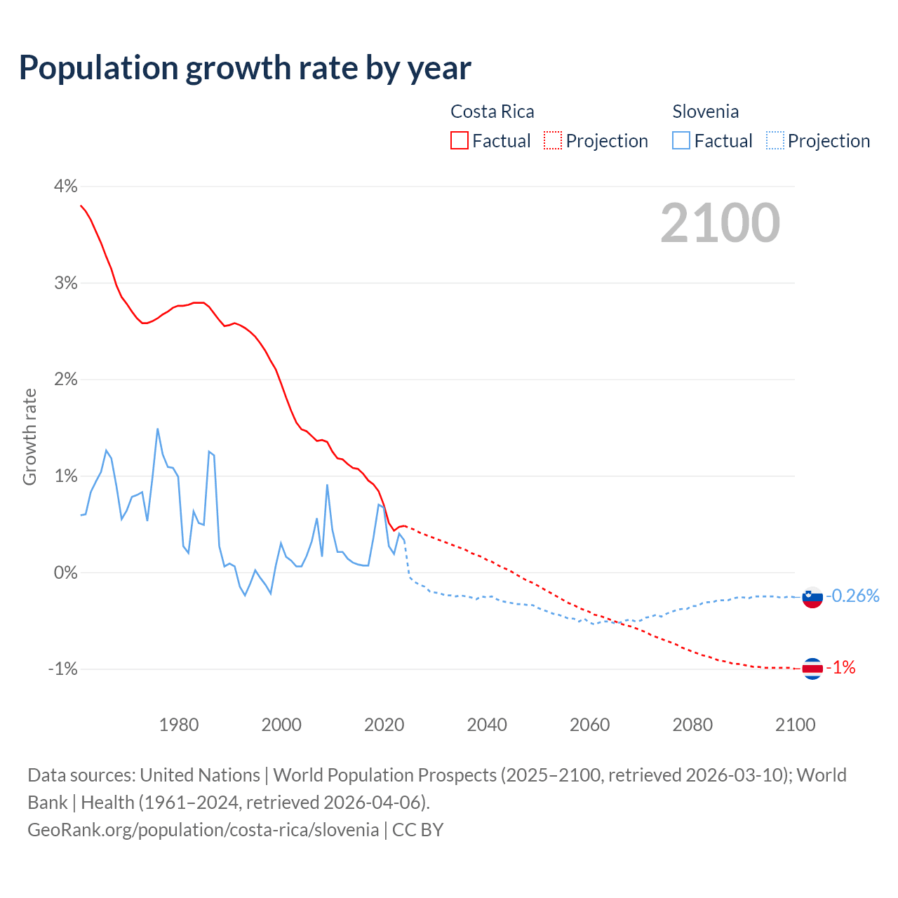 - For the last 10 years, Costa Rica has had an average growth rate of +0.77% per year vs +0.29% in Slovenia.