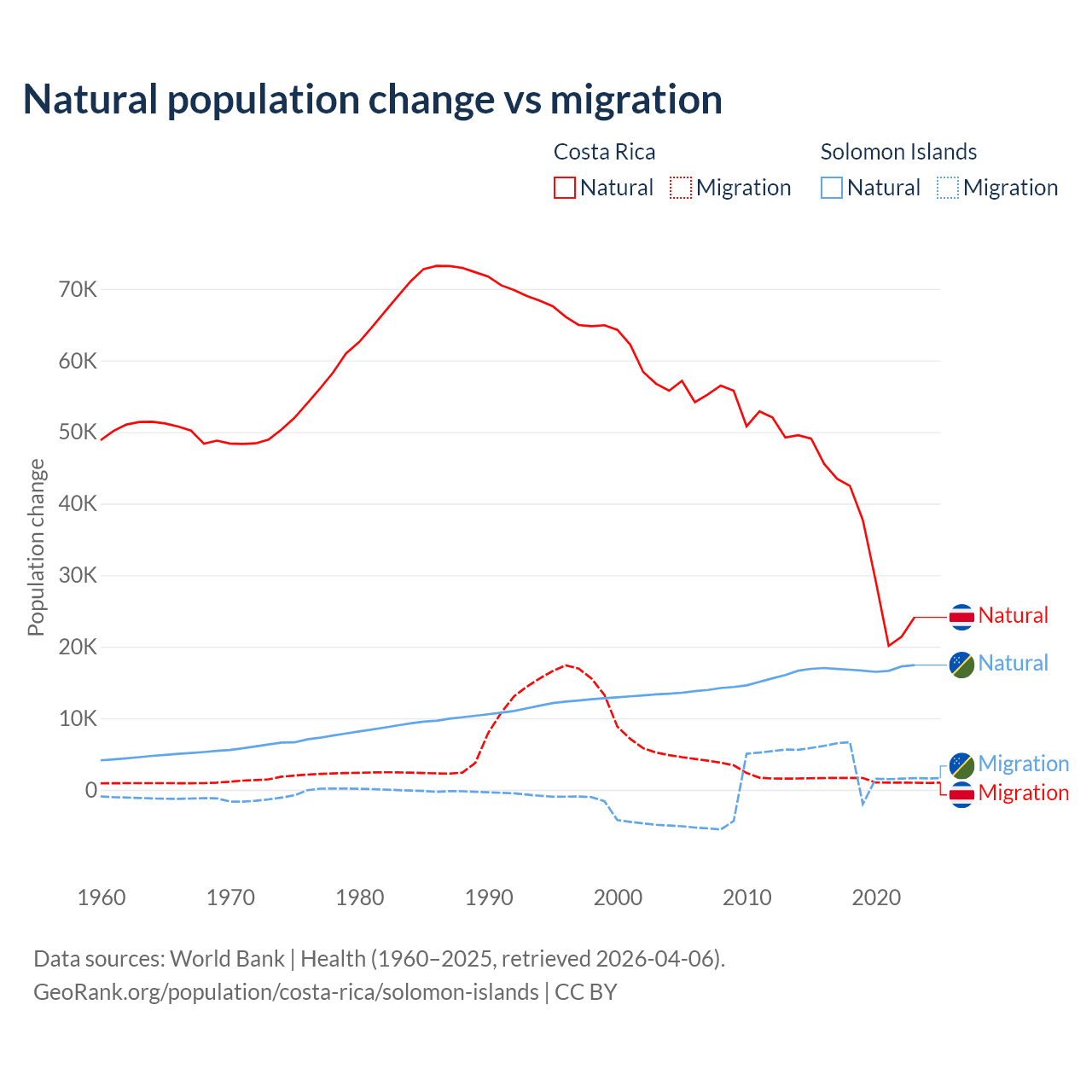 Over the last 10 years, 96.3% of the population change in Costa Rica is from natural causes (a gain of 362,624 people) and 3.69% is from migration (a gain of 13,900 people). In the Solomon Islands 82.8% is from natural causes (a gain of 168,727 people) and 17.2% is from migration (a gain of 35,031 people).