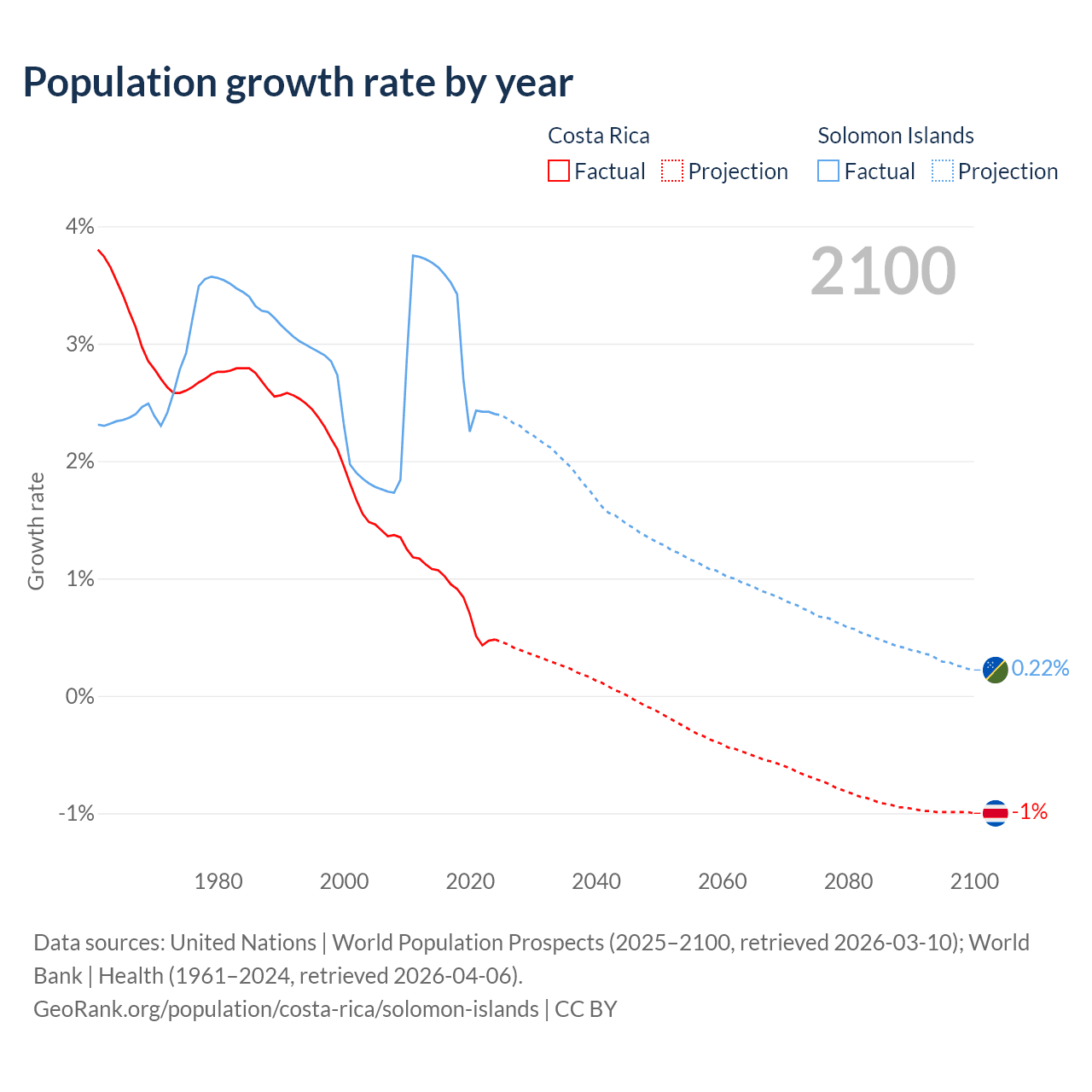 - For the last 10 years, Costa Rica has had an average growth rate of +0.77% per year vs +2.95% in the Solomon Islands.