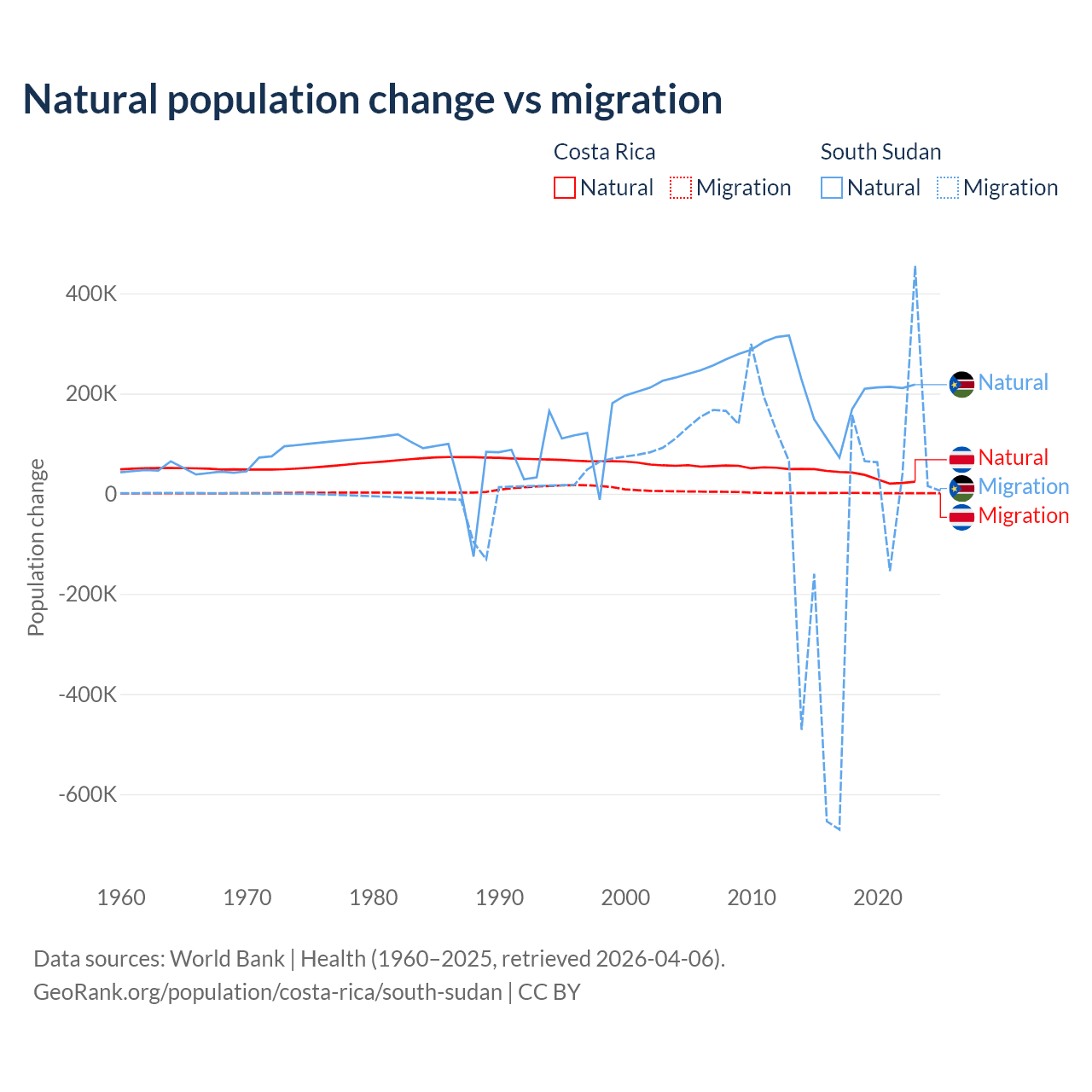 Over the last 10 years, 96.3% of the population change in Costa Rica is from natural causes (a gain of 362,624 people) and 3.69% is from migration (a gain of 13,900 people). In South Sudan 57.4% is from natural causes (a gain of 1,792,135 people) and 42.6% is from migration (a loss of 1,329,606 people).