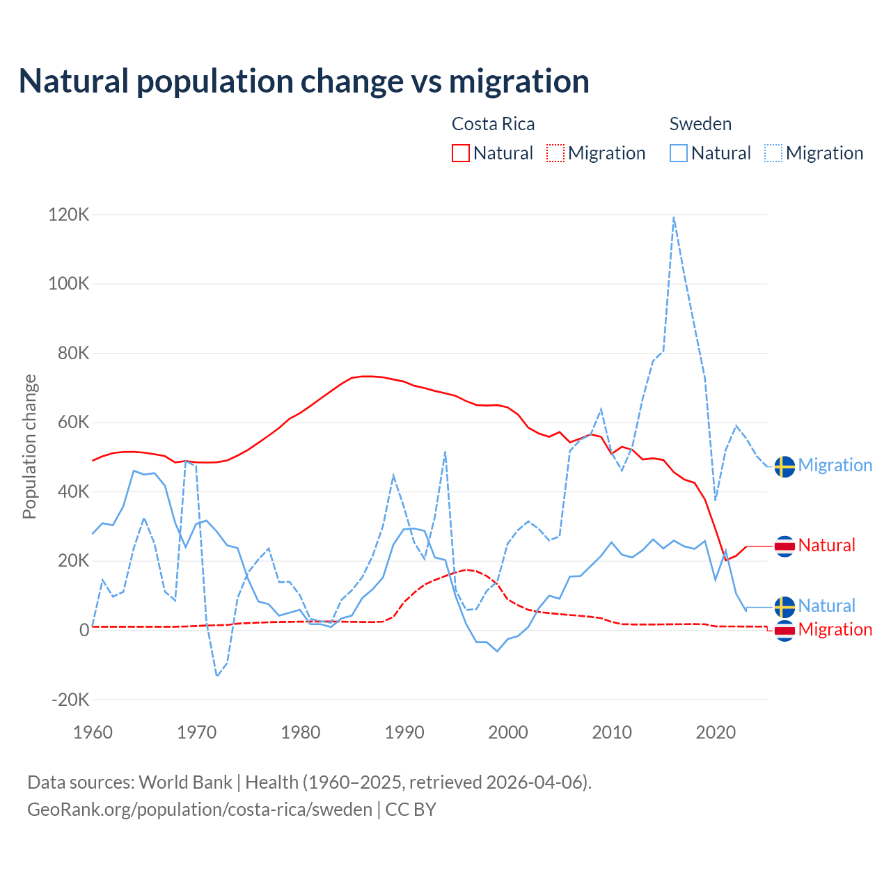 Over the last 10 years, 96.3% of the population change in Costa Rica is from natural causes (a gain of 362,624 people) and 3.69% is from migration (a gain of 13,900 people). In Sweden 21.4% is from natural causes (a gain of 201,900 people) and 78.6% is from migration (a gain of 743,642 people).