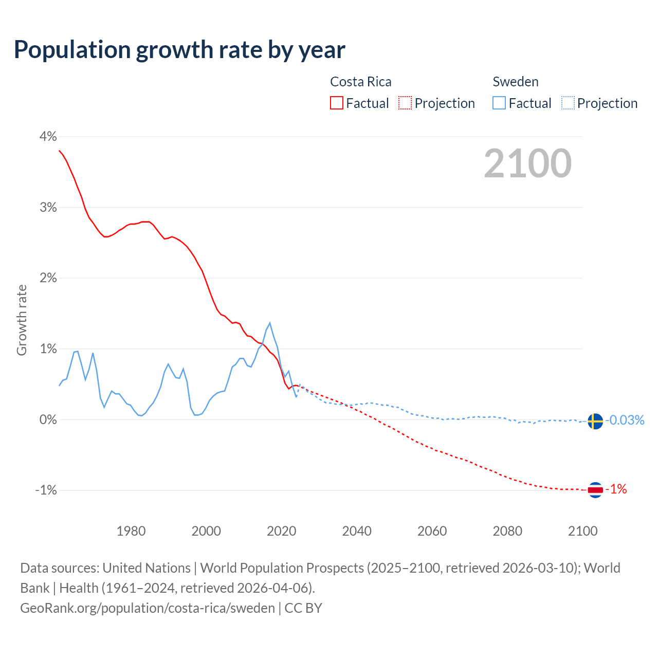 - For the last 10 years, Costa Rica has had an average growth rate of +0.77% per year vs +0.88% in Sweden.