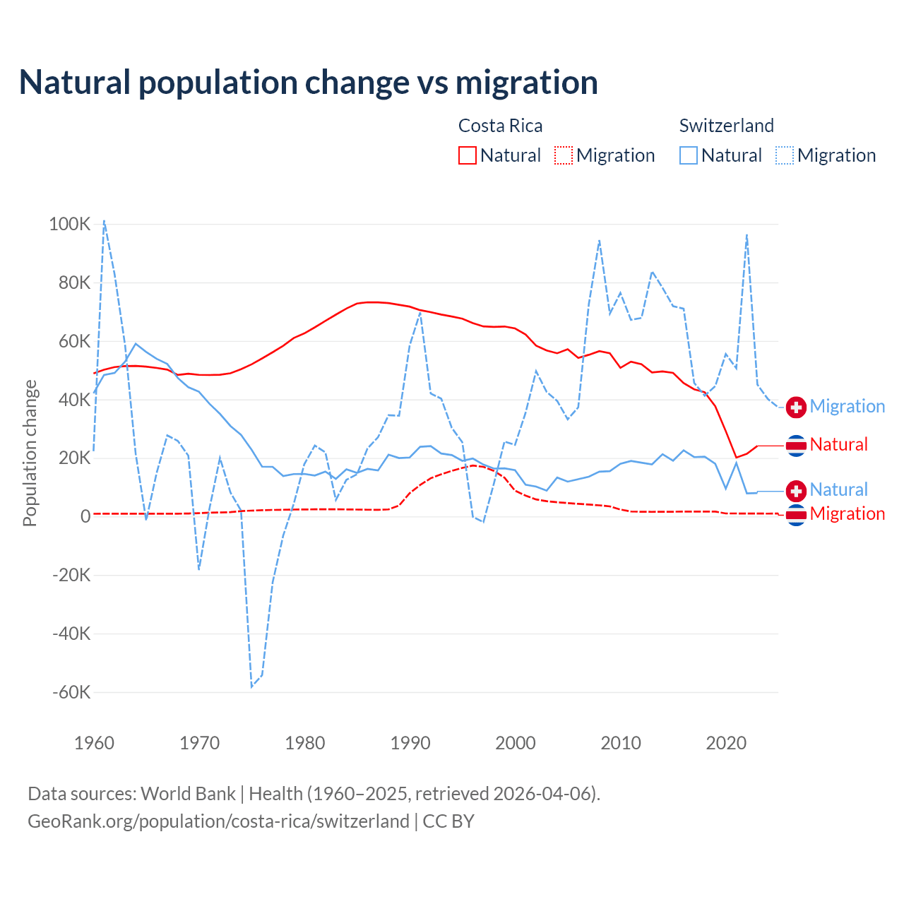 Over the last 10 years, 96.3% of the population change in Costa Rica is from natural causes (a gain of 362,624 people) and 3.69% is from migration (a gain of 13,900 people). In Switzerland 21.6% is from natural causes (a gain of 165,354 people) and 78.4% is from migration (a gain of 600,145 people).