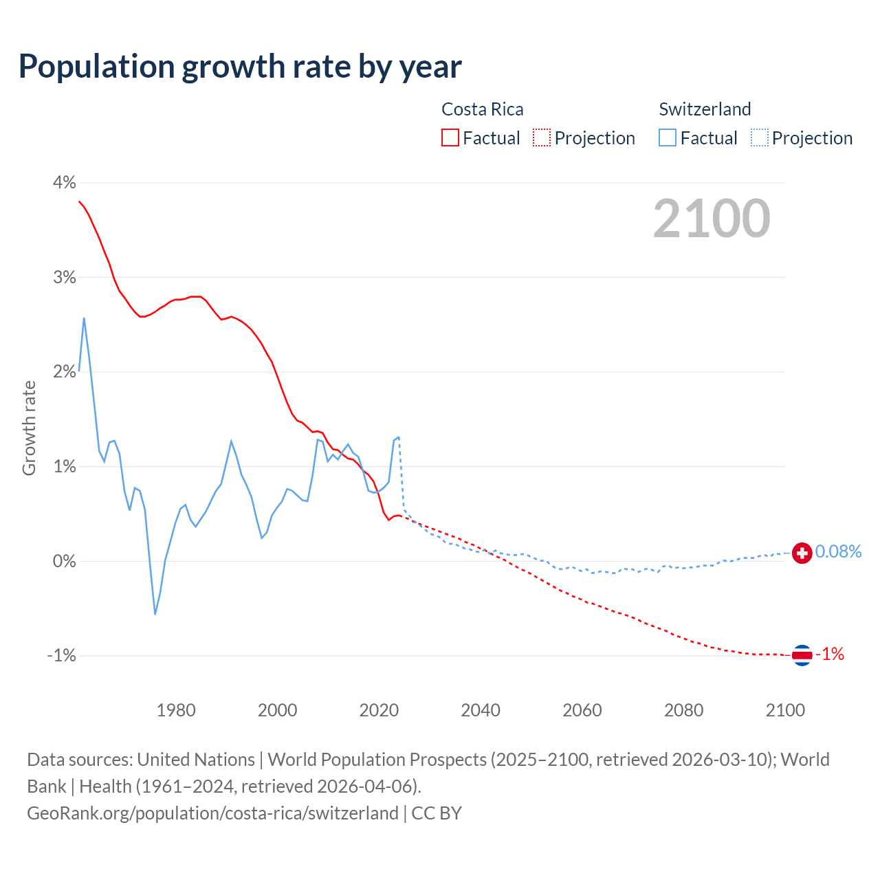 - For the last 10 years, Costa Rica has had an average growth rate of +0.77% per year vs +0.98% in Switzerland.