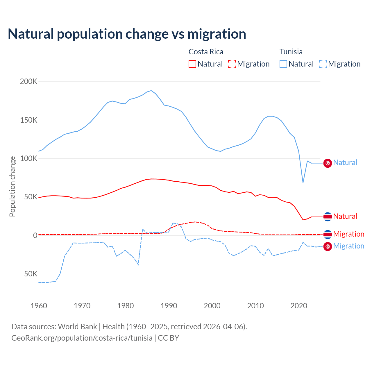 Over the last 10 years, 96.3% of the population change in Costa Rica is from natural causes (a gain of 362,624 people) and 3.69% is from migration (a gain of 13,900 people). In Tunisia 86.3% is from natural causes (a gain of 1,225,079 people) and 13.7% is from migration (a loss of 195,011 people).