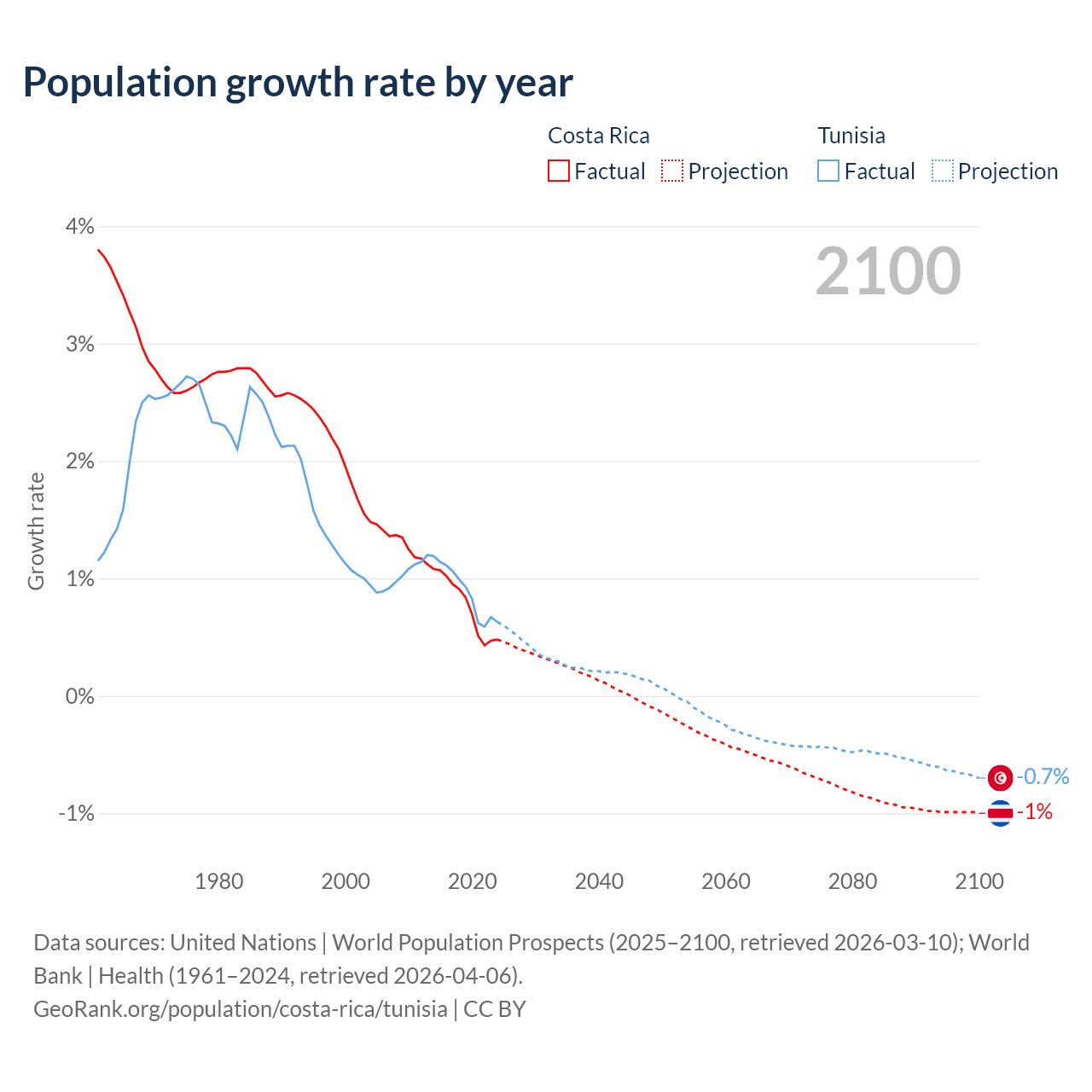 - For the last 10 years, Costa Rica has had an average growth rate of +0.77% per year vs +0.89% in Tunisia.
