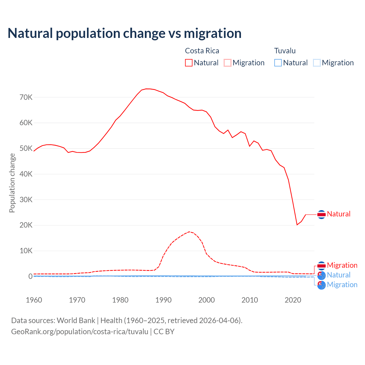 Over the last 10 years, 96.3% of the population change in Costa Rica is from natural causes (a gain of 362,624 people) and 3.69% is from migration (a gain of 13,900 people). In Tuvalu 35.5% is from natural causes (a gain of 1,556 people) and 64.5% is from migration (a loss of 2,827 people).