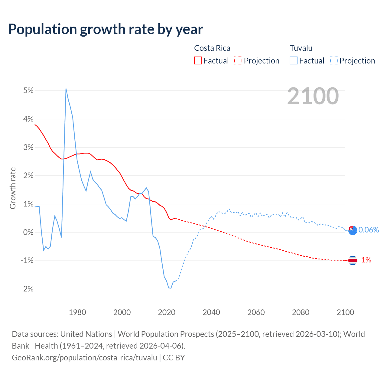 - For the last 10 years, Costa Rica has had an average growth rate of +0.77% per year vs -1.19% in Tuvalu.